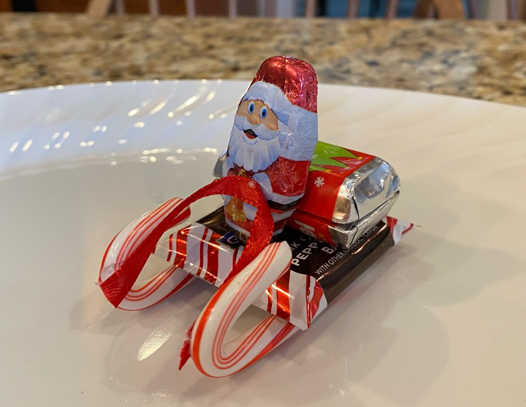 - Place the Santa on the Ghirardelli bar in front of the mini chocolates