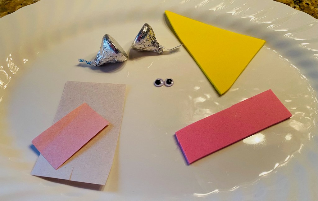 - Then glue the ears onto the base of one of the Hershey Kisses