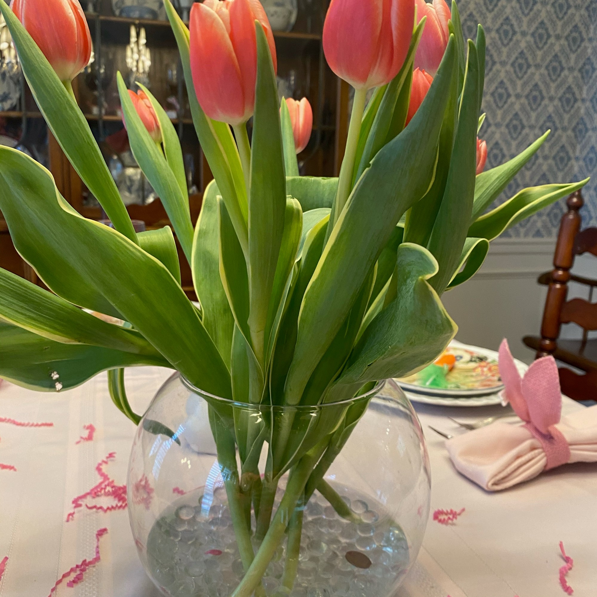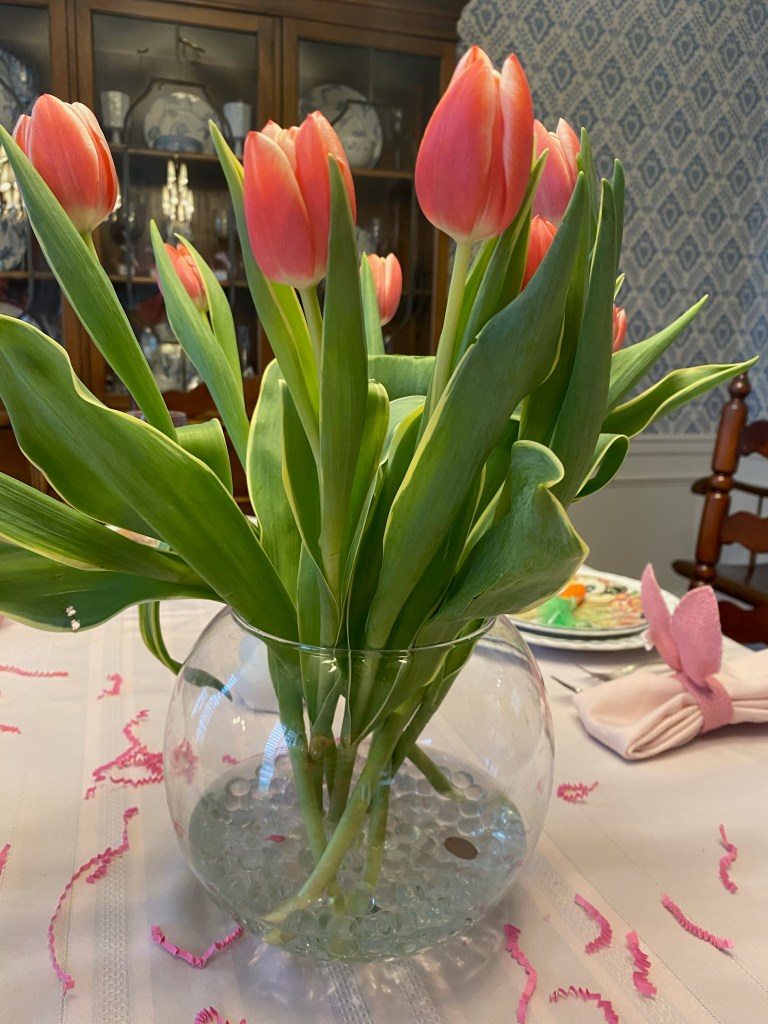Ever wish your centerpiece of cut fresh tulips would stand up in the vase rather than droop? Well wish no more….the answer is to merely place a penny in the bottom of the vase and like magic the tulips stand right up.