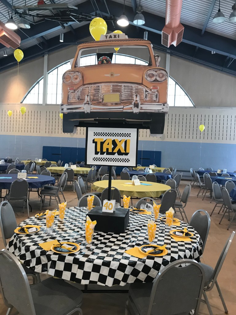It’s been over a year since B-Crafty shared a team trivia theme. The theme for the annual Team Trivia Night was “Sit Coms” and B-Crafty came up with “Taxi”. The yellow, black and white colors made the table pop!