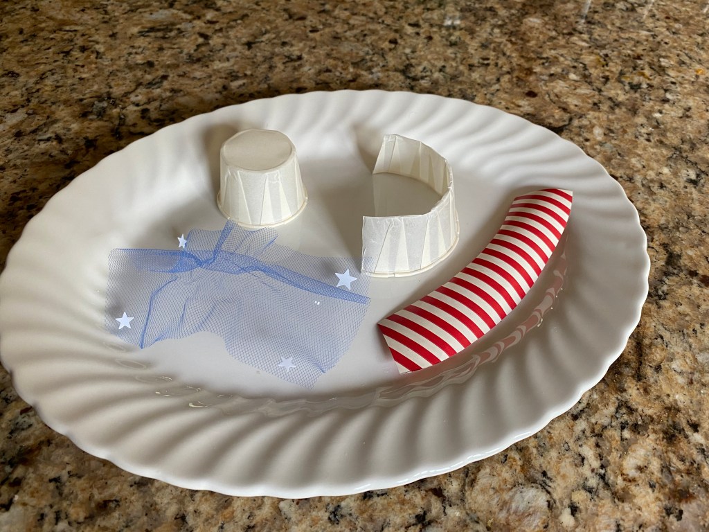 - One mini white paper pleated nut cup PLUS another cup to cut apart to make a pattern for the wrapping paper