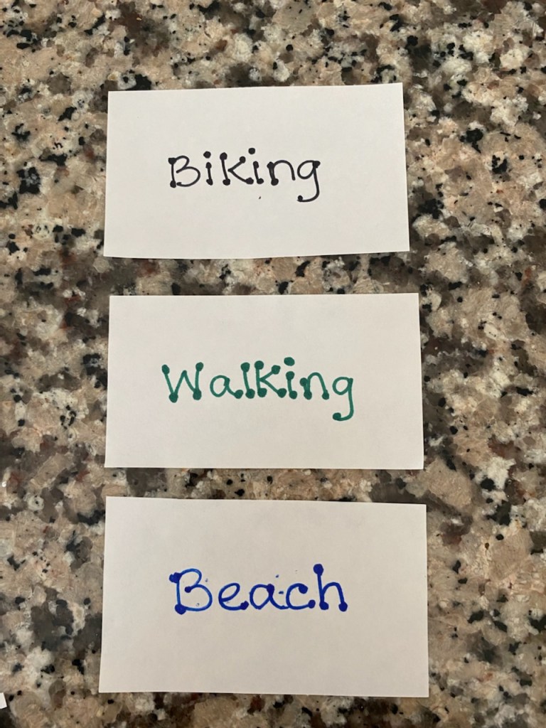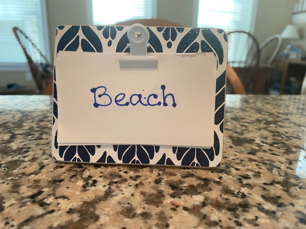 B-Crafty is usually the early riser when her family is on vacation in Ocean City, NJ, so she is constantly leaving notes for them in the morning to tell then where she is. So rather than keep searching for notepaper and a pen, she devised this system to communicate her whereabouts. Crafty and practical!