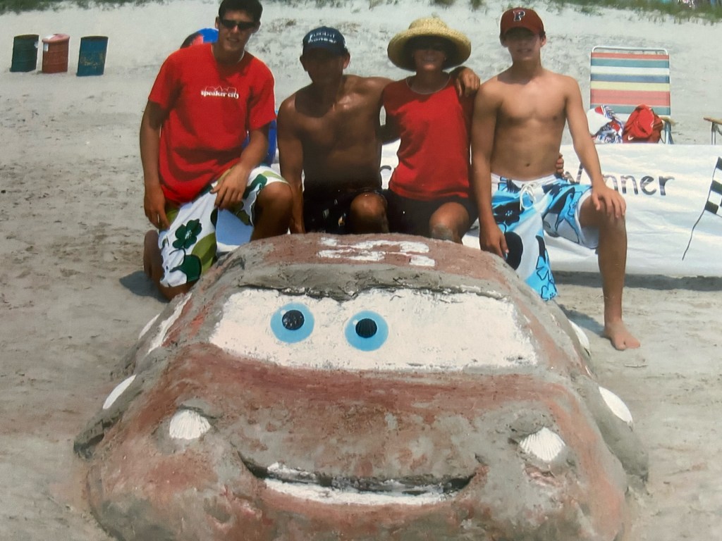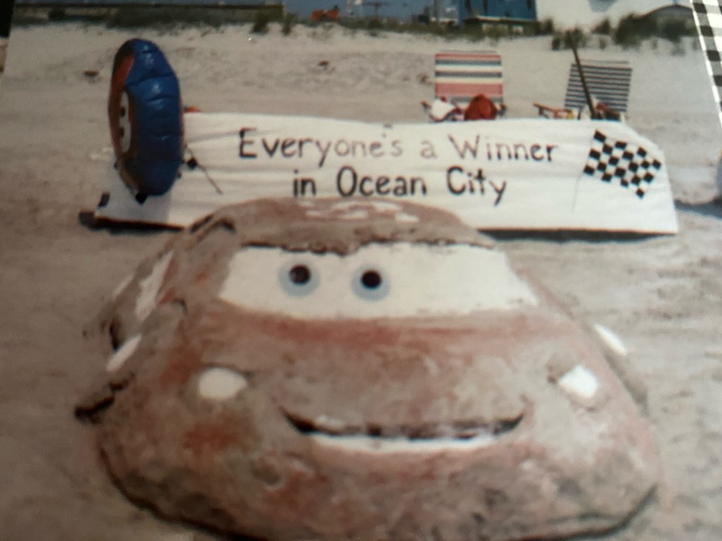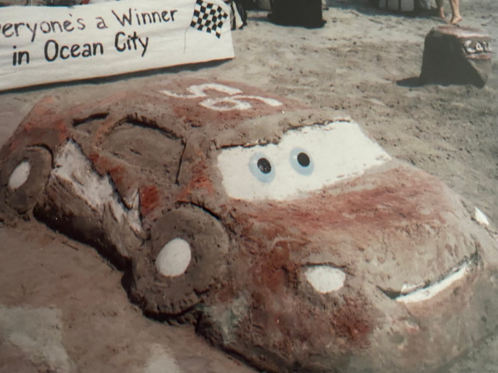In 2006 with the popularity of “Cars” growing, B-Crafty and her family built “Sand Lighting McQueen”. The keys to this sculpture were the eyes B-Crafty painted onto large shells and using flour for the windshield. This one really attracted the young kids on the beach.