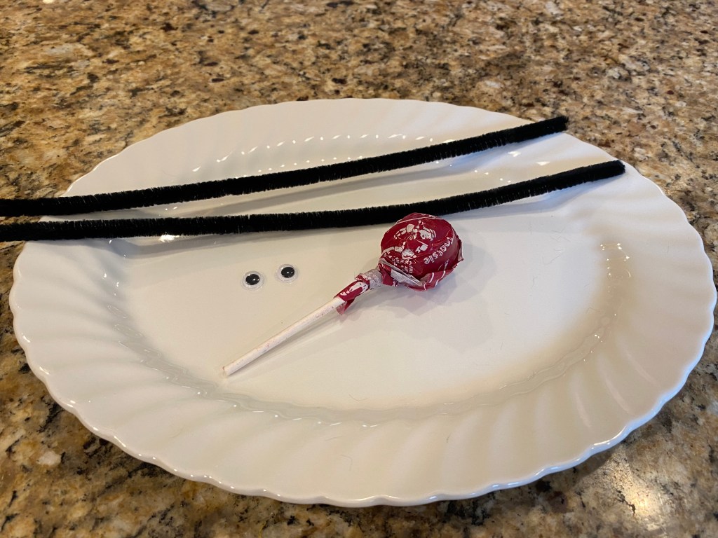 • With the hot glue affix both googly eyes on the center section of the pipe cleaners facing away from the candy part of the lollipop
