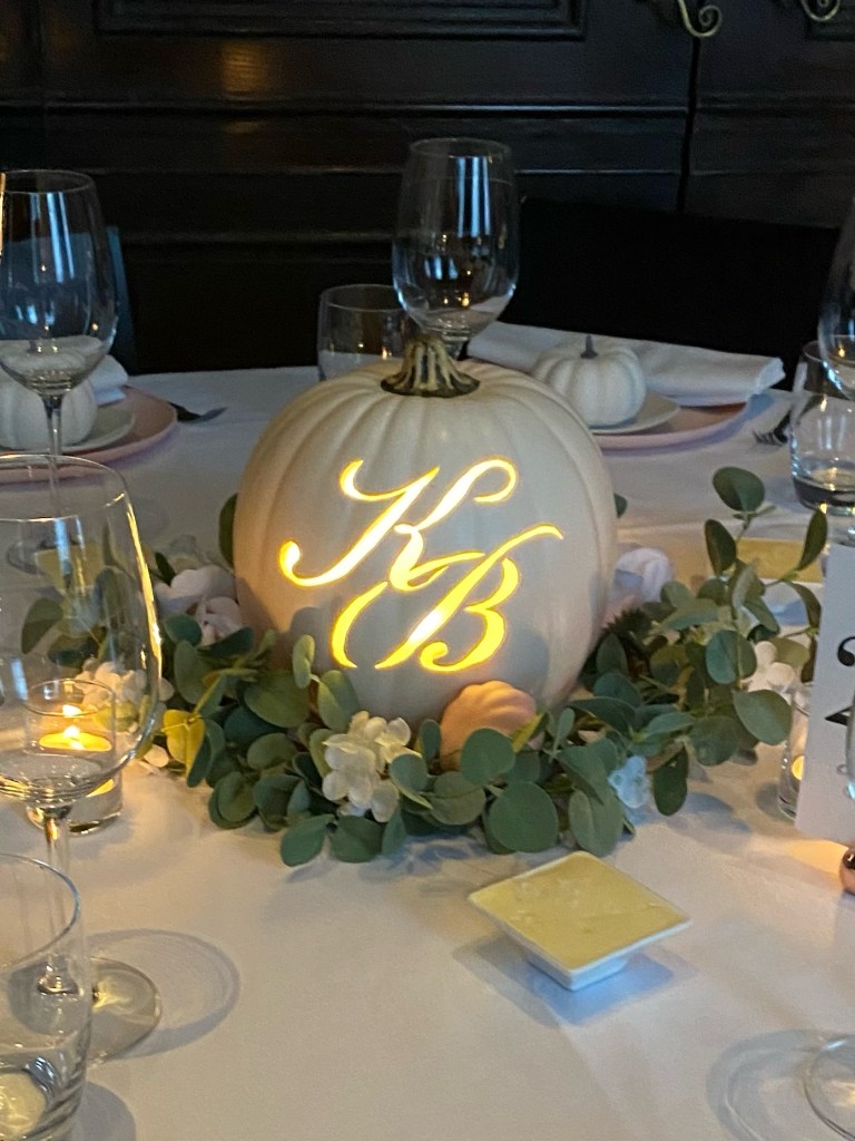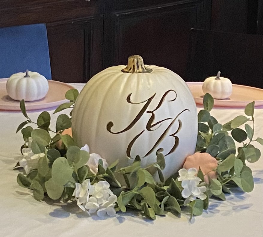 This Thanksgiving B-Crafty was thankful for he expanded family, a new daughter-in-law and to continue the celebration she presents the, Rehearsal Dinner Centerpiece”. It  is with with further thanks that B-Crafty acknowledges her dear friend, T-Crafty, for actually carving the pumpkins with the bride and groom’s initials.