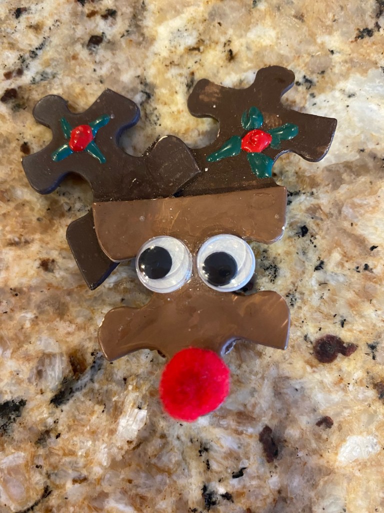 When B-Crafty’s son was in preschool, he made this “Puzzle Piece Reindeer Pin” over 25 years ago and she still wears it. The hardest part is painting the puzzle pieces, but that step can be done ahead of time if doing this craft with your child.