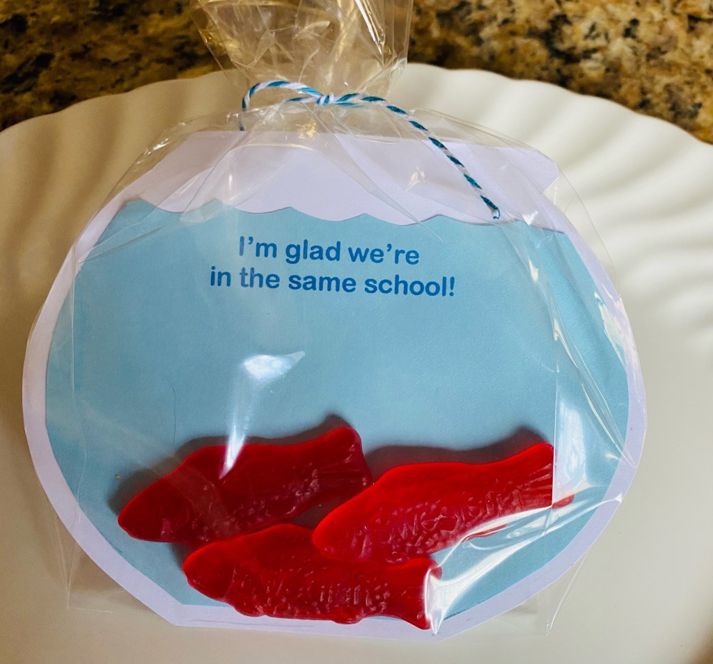 B-Crafty brings back a Valentine idea from years ago, “Fish Bowl Valentine”. Depending on the treat you include it could be “Gold Fish Bowl Valentine” or “Swedish Fish Bowl Valentine”. You get to choose.