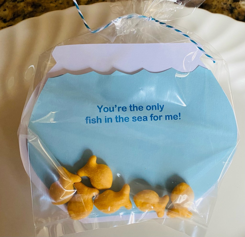 - Decide the message you want, “I’m glad we’re in the same school” or “You’re the only fish in the sea for me” and print on t the blue paper separated by approximately 4 inches