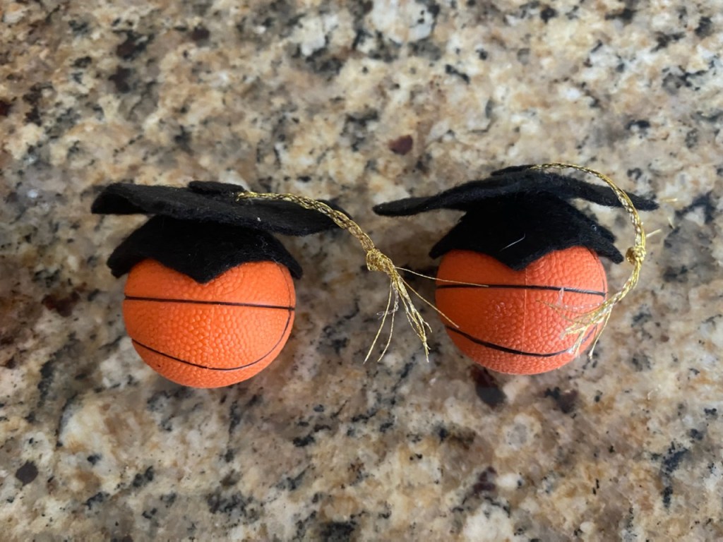 B-Crafty Tip: Another great use of the small toy basketballs is to decorate them with a black felt graduation cap complete with a gold tasseled cord. This is a wonderful favor for your favorite basketball player to celebrate their Senior Night.