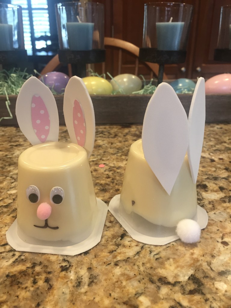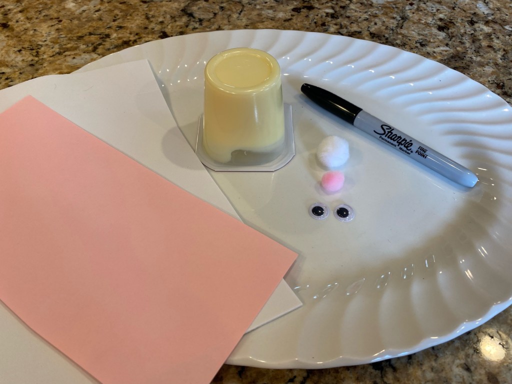 - On the back of the pudding cup glue the white pom-pom for the bunny’s tail