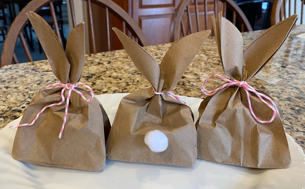 - Tie a bow with the baker’s twine at the top of the bag right at the base of the ears