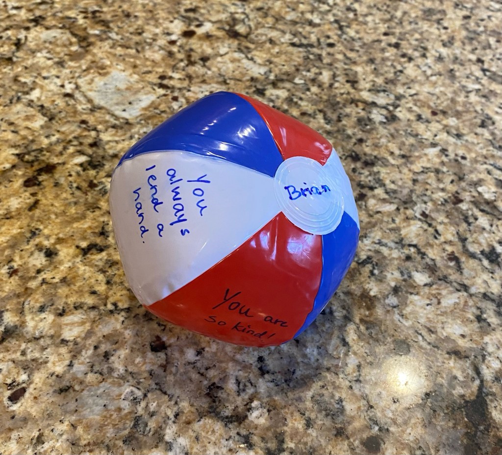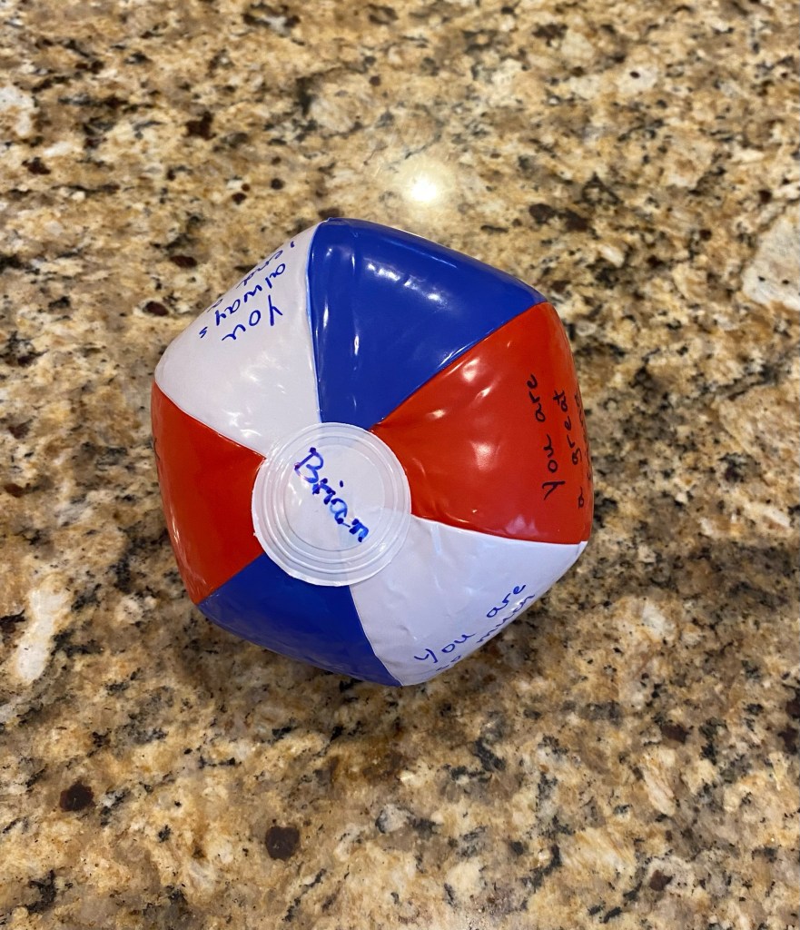 - Inflatable beach ball (any size from 5” up to 12”)