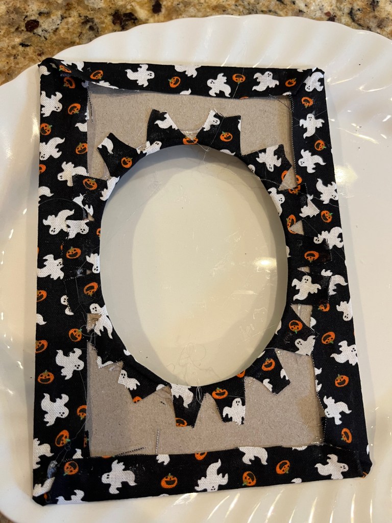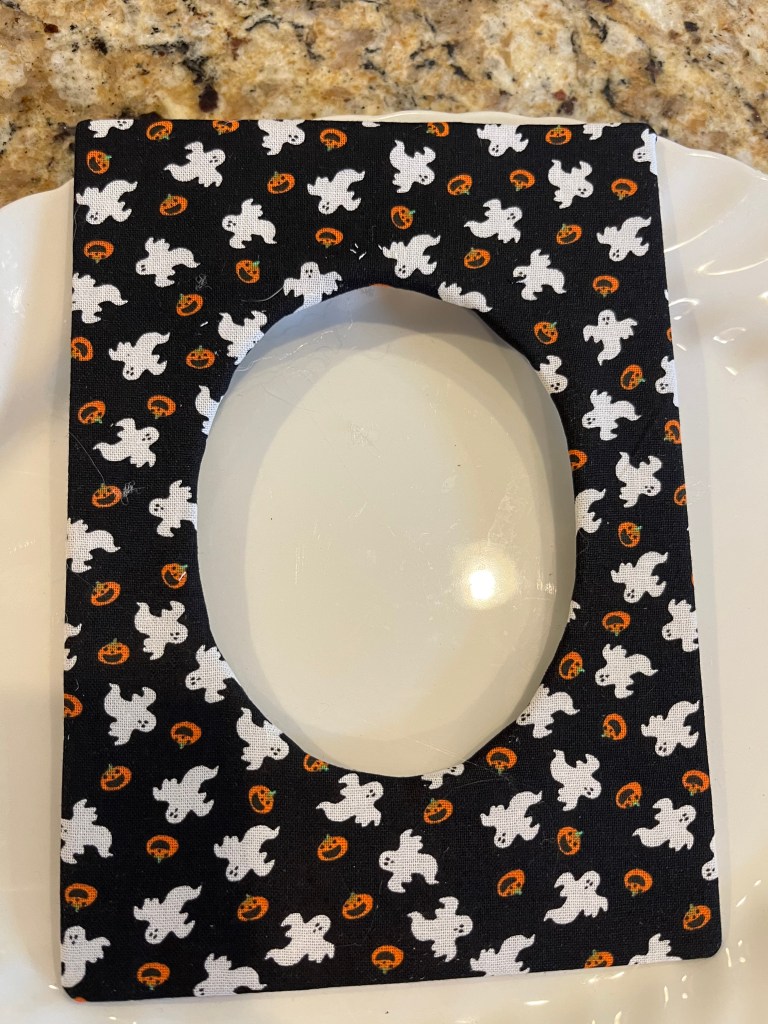 - Wrap the material over the two pieces of cardboard and turn it over each edge securing it with hot glue, including the oval