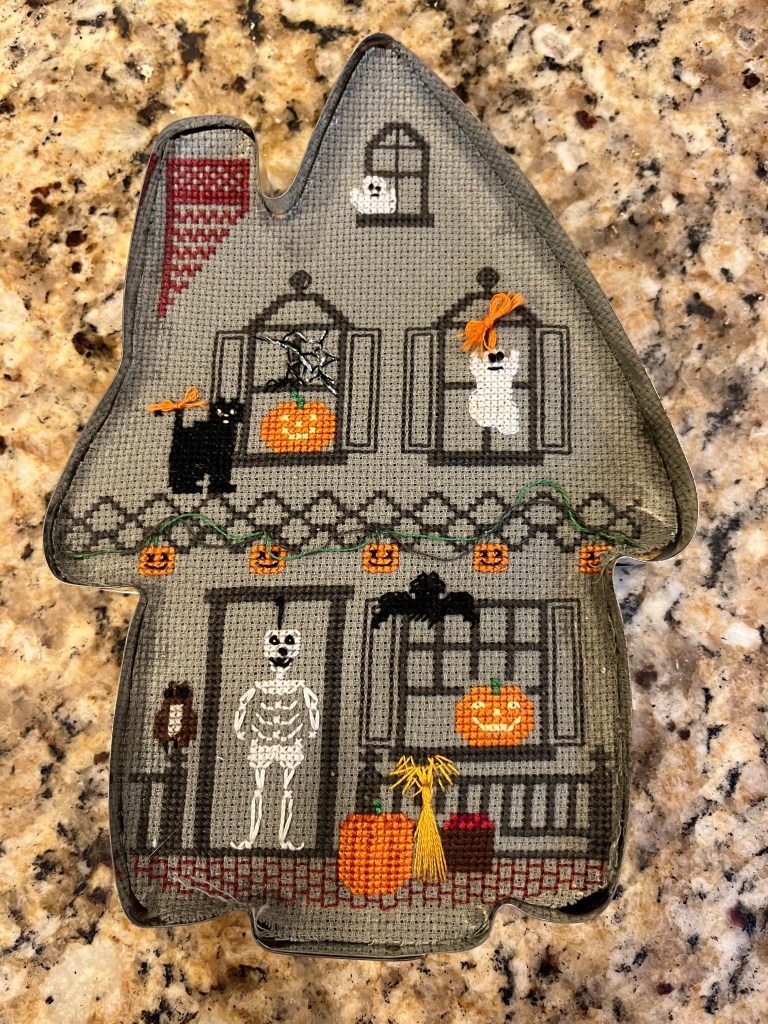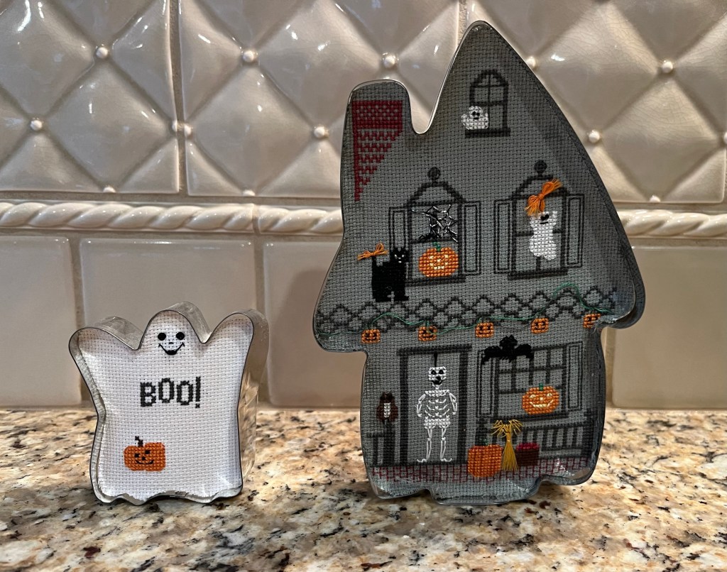 Every year looks B-Crafty looks forward to displaying her “Halloween Cookie Cutter Cross Stitch” decoration. B-Crafty made these of over 30 years ago, so the hard part may be finding the aluminum cookie cutters. Hope you find this “trick” to be a real “treat”.