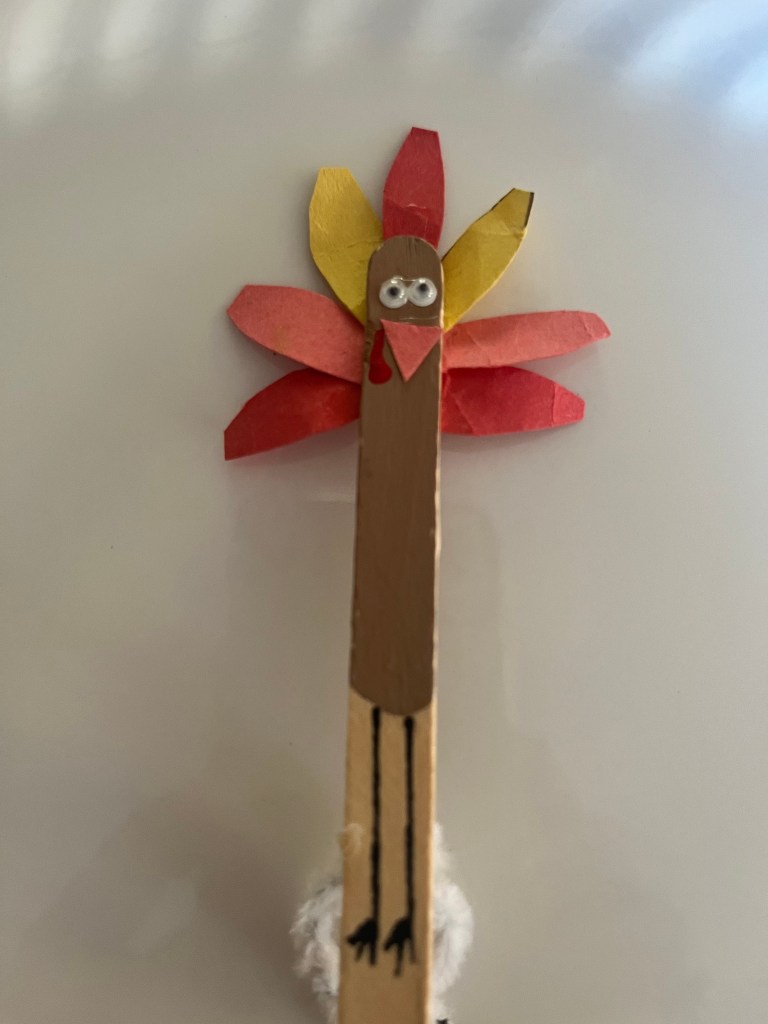 B-Crafty made this “Finger Puppet Turkey” many years ago to entertain her sons at Thanksgiving time. They are versatile enough that without the pipe cleaner on the back, you can use them as a decoration to stick in a dip or other dish.