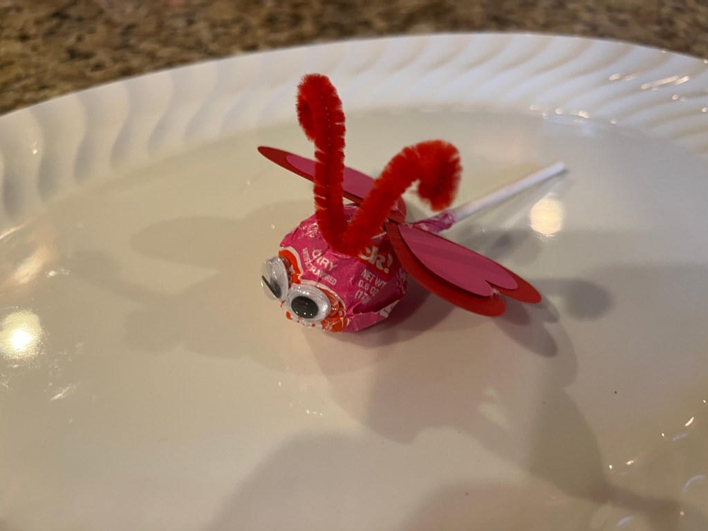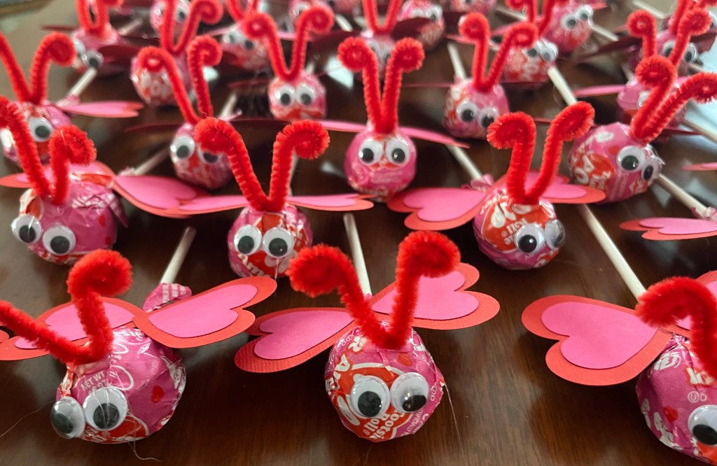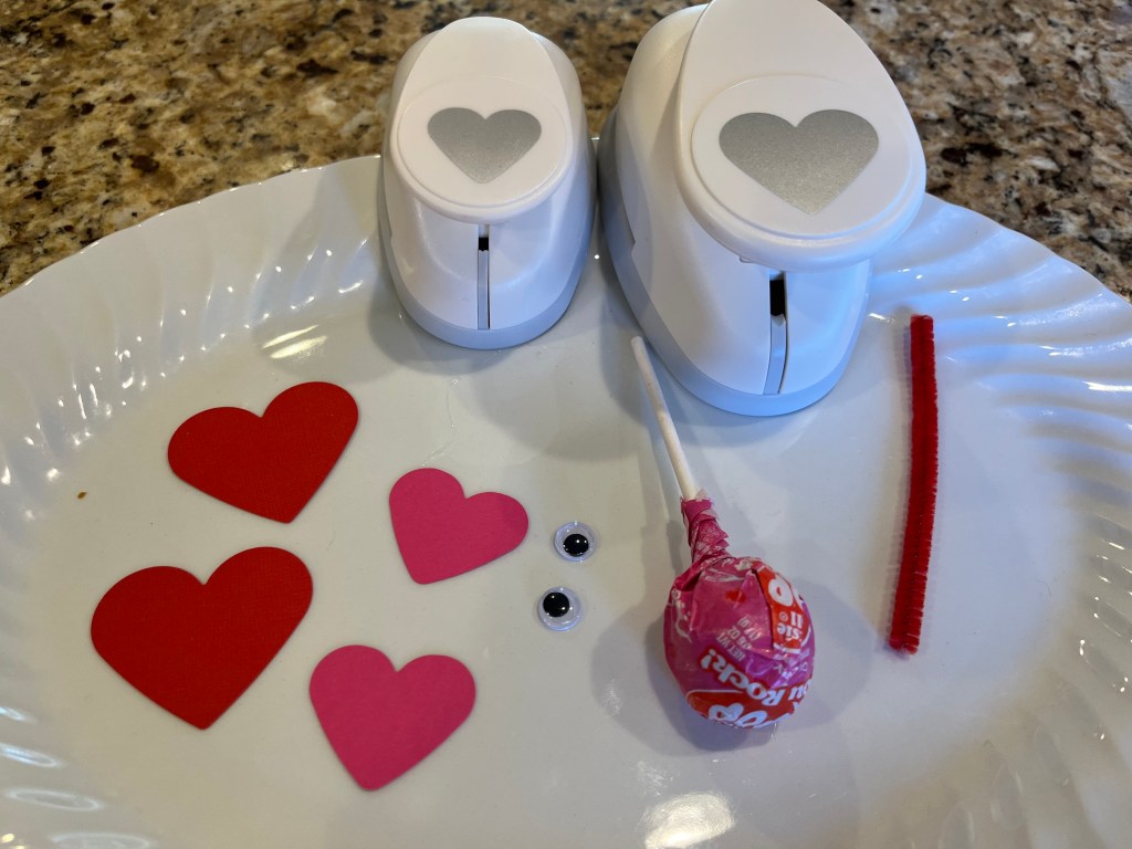 - Valentine’s Tootsie Roll Pops (or any pink or red wrapper one)