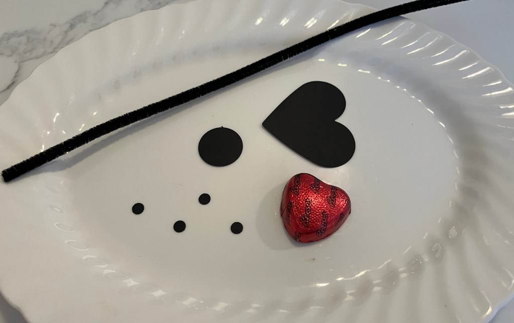 - With the hot glue place a few dabs on the black heart piece and place the peanut butter cup on top