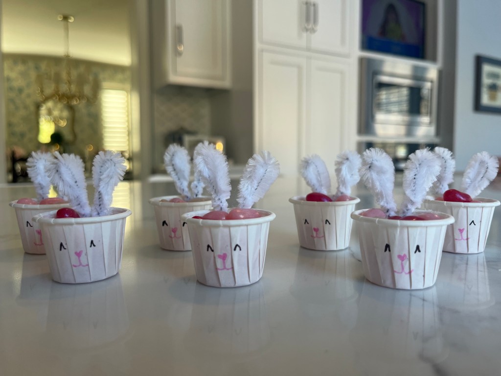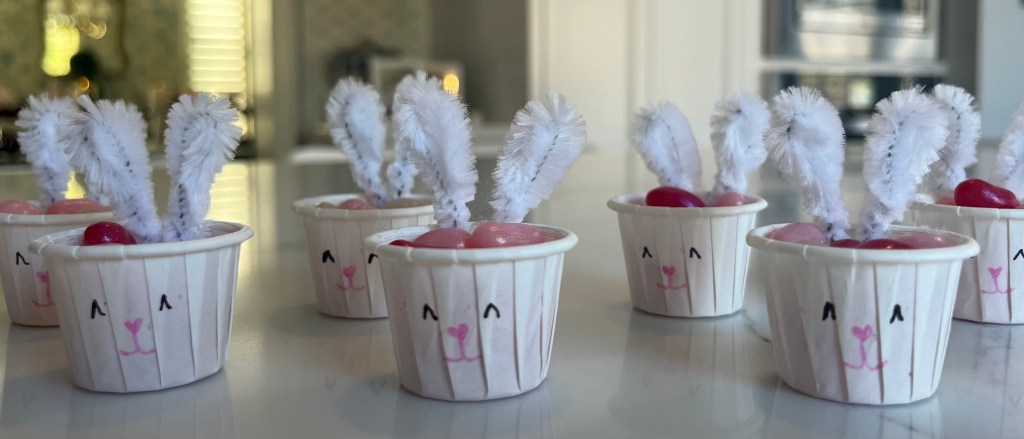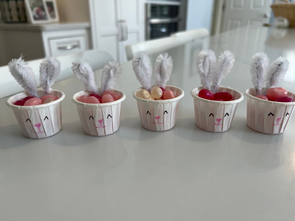 B-Crafty Tip: B-Crafty made a little stencil to draw the eyes and nose on each bunny cup. It made them all look uniform. Also try to avoid drawing over the folds on the cup.