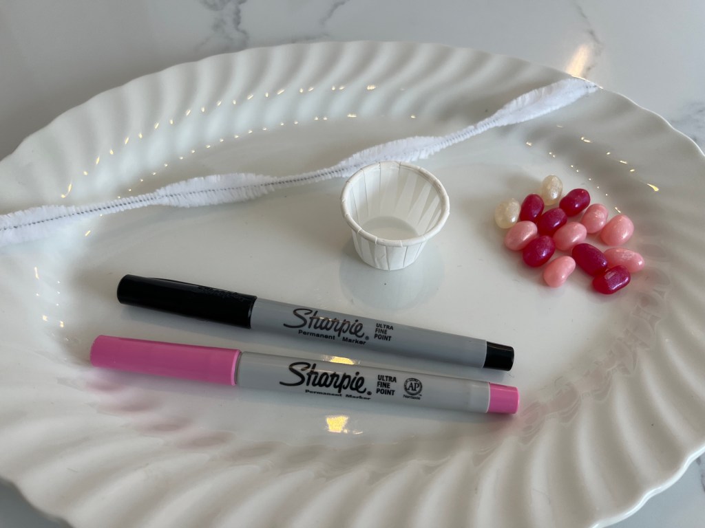 - With the Sharpies draw the eyes in black and the nose and mouth in pink