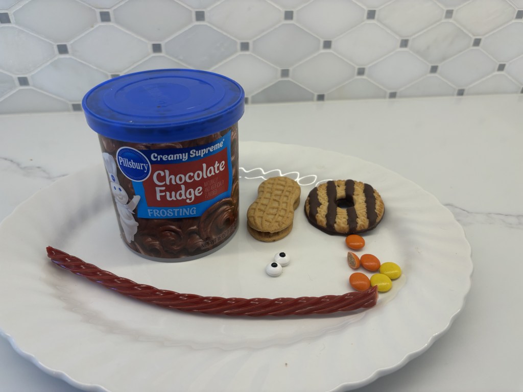 - Using the icing again, put 5 dabs on the Fudge Stripe cookie with about the Nutter Butter and affix the orange and yellow Reese’s Pieces alternating orange and yellow