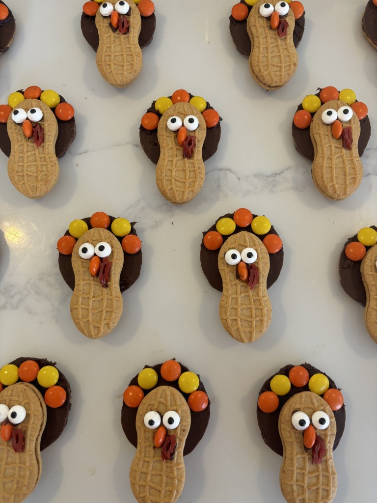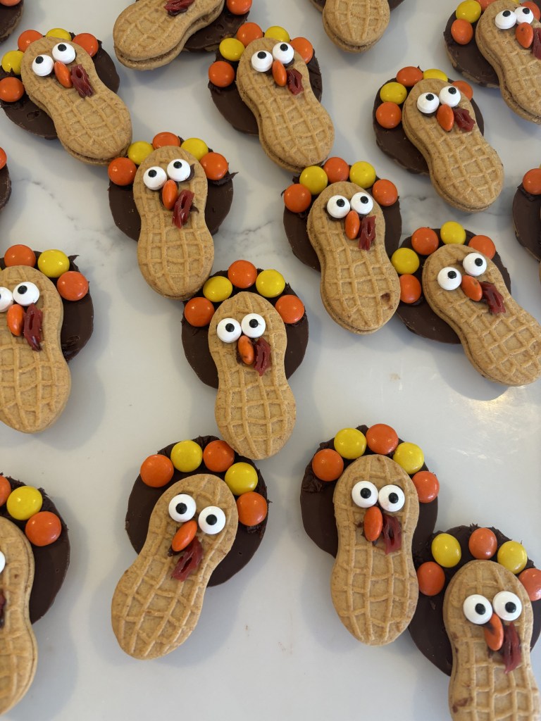 - Cut an orange Reese’s Pieces in half and with a dab of icing affix it to front of Nutter Butter for the turkey’s beak