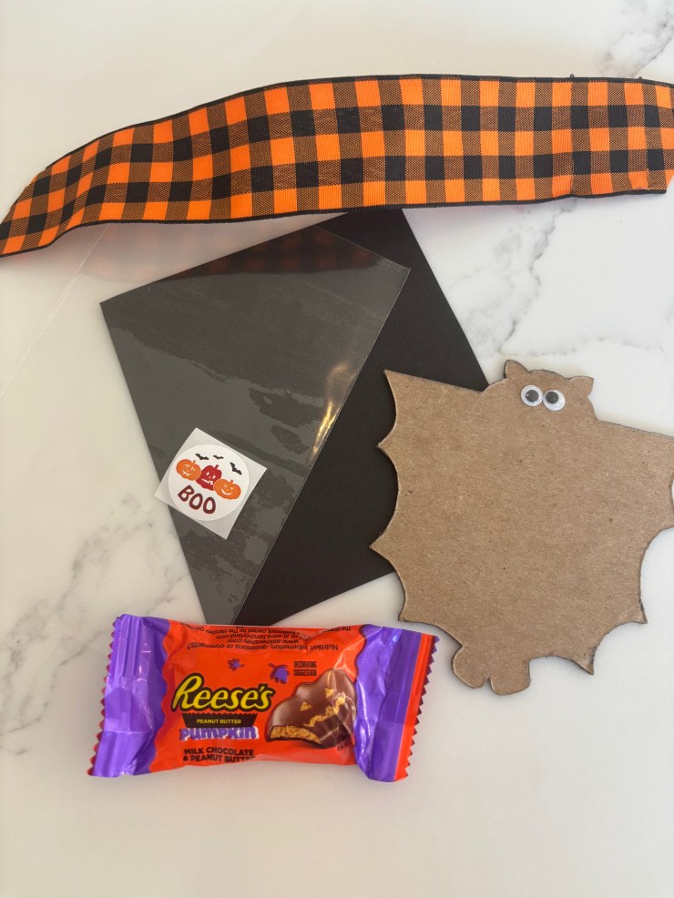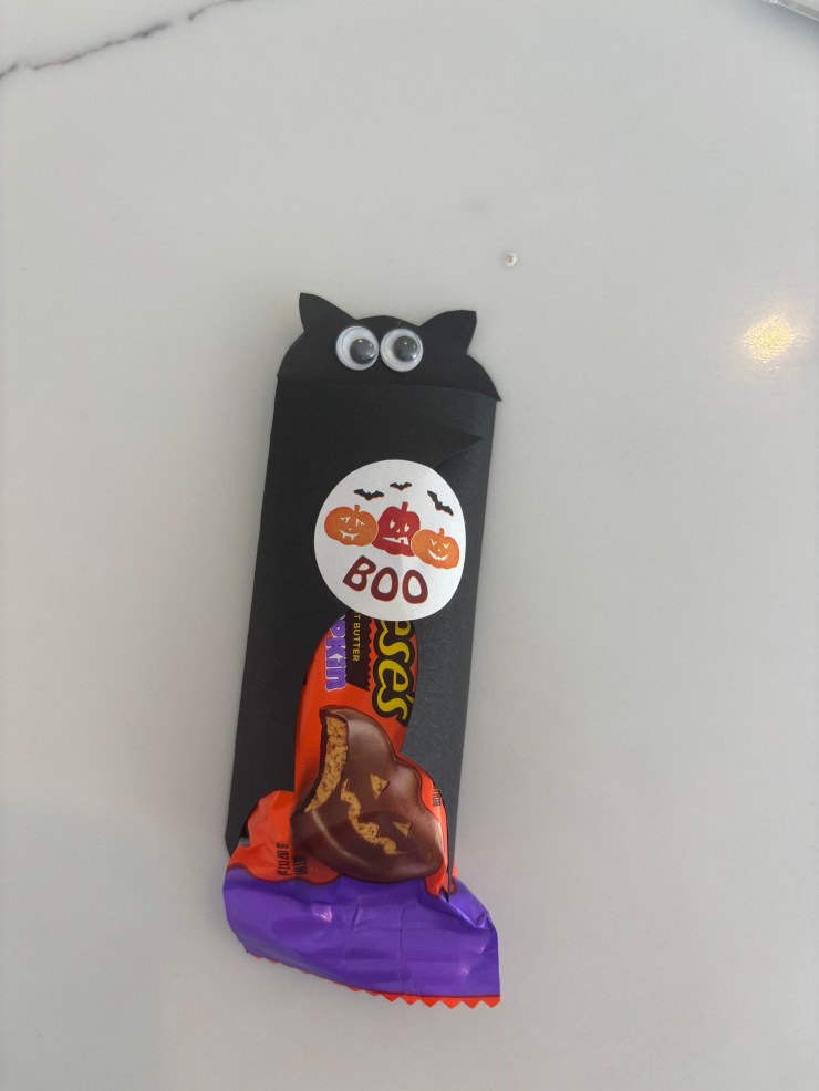 B-Crafty Tip: B-Crafty glues the eyes as close to the top of the bat head as possible so they will be seen over the candy that the bat hugs. B-Crafty also packages the bats in small cellophane bags and ties with a black and orange ribbon.