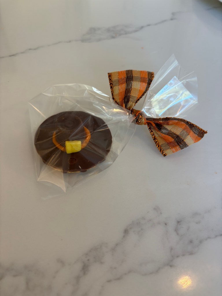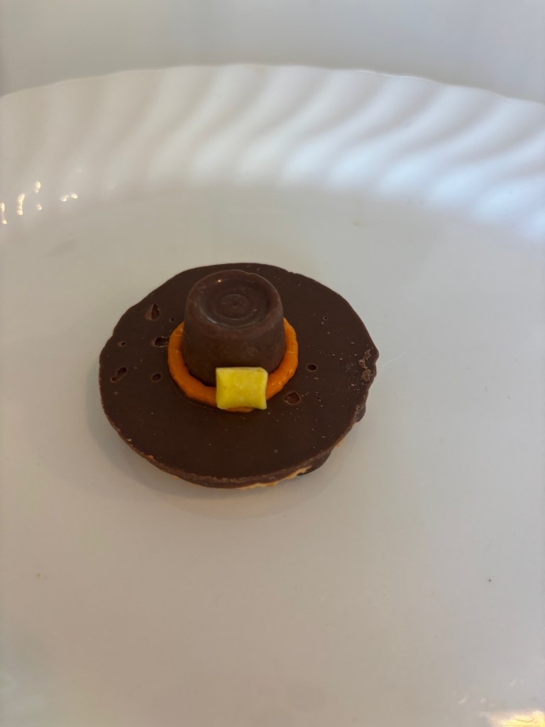 B-Crafty took a pivot from the traditional turkey craft and ventured into the fudge stripe cookie/Rollo “Pilgrim Hat”. Thankful beyond measure for the ability to make my crafts and share them.